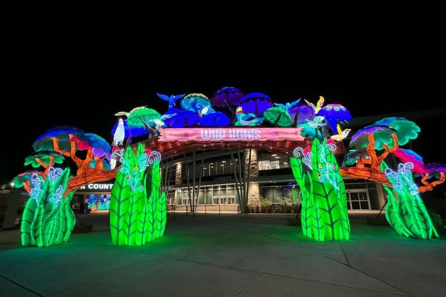 A nighttime immersive light exhibit featuring themed displays and seasonal ambiance.