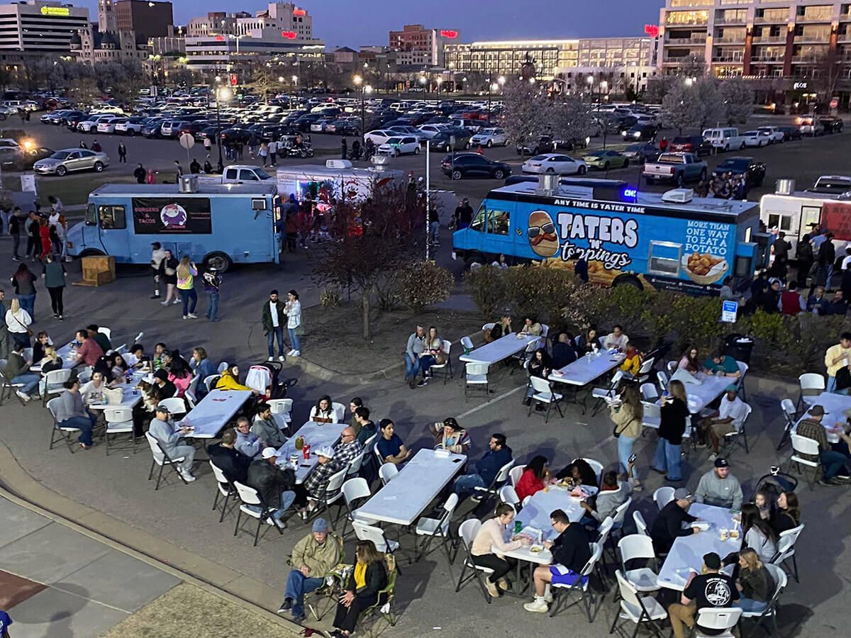 A lively downtown event featuring food trucks, drinks, and local vendors.